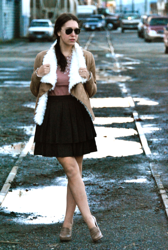 RayBan Aviator Sunglasses / Charlotte Russe Necklace / Need Supply “Shearling Lined” Jacket / Loft Blouse / ModCloth “Pretty Pleats” Skirt / Aldo Shoes (c/o)