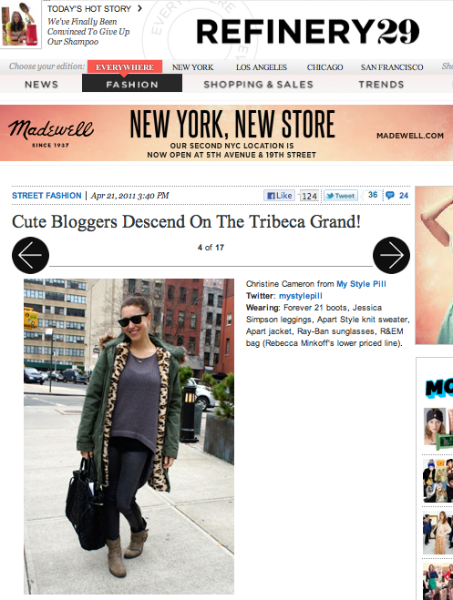 Remember last week when I wrote about running late for a breakfast meeting and I dressed up in bright blue palazzo pants and a fancy top to brighten my mood? Well, I thought it would be fun, and funny, to share with you what I actually looked like earlier that morning. It just so happened that the meeting I was at was for Refinery29, and they snapped a street style photograph of me outside as we were all leaving. I was really excited when I saw this article on their website, but sort of annoyed that I didn’t style myself up and look a little more put together. Ah, coulda, shoula, woulda.
